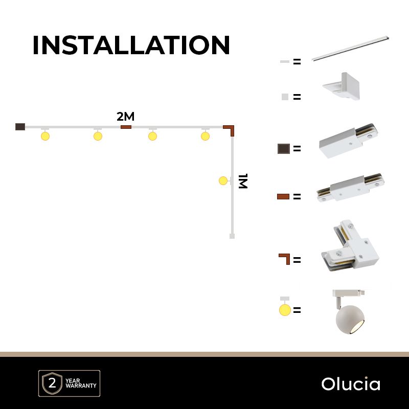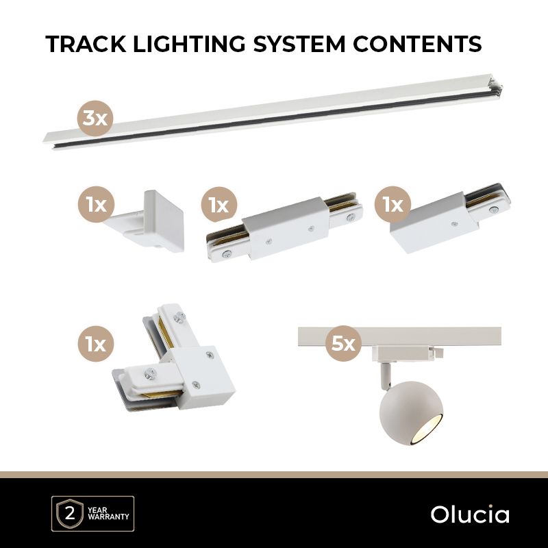 Special Price 109,- Adviesprijs: Regular Price 119,-Op voorraad 3M wit 1-fase railverlichting systeem met hoekstuk + 5 Elena railspots- 300 cm
