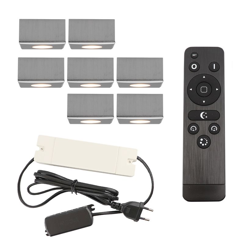 In een set zitten de volgende artikelen: 7 geborsteld chroom veranda spots met 5 meter aansluitkabel, een verdeel box met trafo en stekker en een afstandsbediening (zonder 2 AAA batterijen) om de spots te kunnen dimmen. U kunt de set naar wens uitbreiden met langere aansluitkabels en een muurdimmer, zie hiervoor het kopje accessoires.
