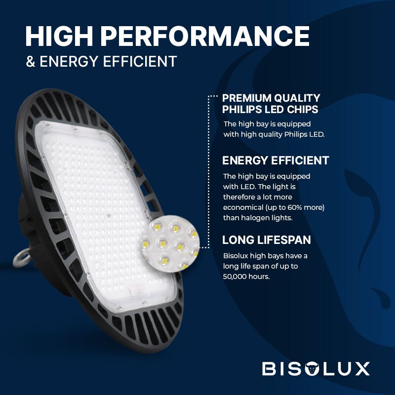 De Bisolux LED High Bay met Philips trafo is de ideale verlichting voor grote ruimtes. De High Bay produceert enorm veel licht en is daardoor met name geschikt voor ruimtes hoger dan 5 meter. De stevige LED lamp geeft krachtig en helder licht en zorgt voor een grote lichtopbrengst. De lichtbron verspreidt een grote hoeveelheid licht en met een lichthoek van 120 graden komt het licht in alle hoeken van de ruimte. Met een LED High Bay verlicht je efficiënt hoge ruimtes zoals magazijnen, werkplaatsen, (fabrieks)hallen, opslagruimtes, schuren en open stallen. Een High Bay hangt voornamelijk in ruimtes met een hoogte tussen de 5 en 12 meter. Maar ook een ruimte van 20 meter hoog verlicht de High Bay lamp met gemak.