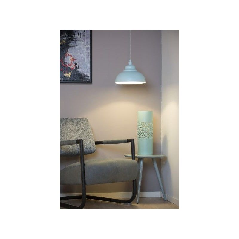 Blauwe hanglamp Isla heeft een moderne look. De lamp bestaat uit metaal en heeft een mooie, rond gevormde kap. Perfect voor boven de eettafel of het bureau. Is blauw niet de kleur die u zoekt? De lamp is ook te bestellen in het creme, bruin, grijs of roz De IP waarde is 20 wat inhoudt dat de lamp geschikt is voor gebruik binnenshuis en niet geschikt is voor buiten of in de badkamer vanwege water en vocht dat in de lamp kan komen.