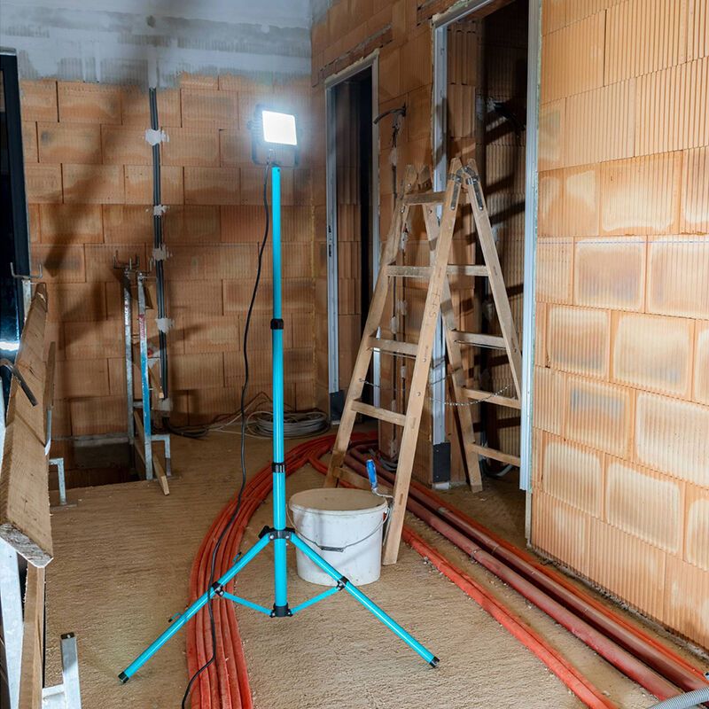 Special Price 129,- Adviesprijs: Regular Price 139,-3-6 werkdagen Blauwe werklamp aluminium, Angelos, 100W, 4000K LED, IP65, met schakelaar- B: 68,5 cm, H: 201 cm