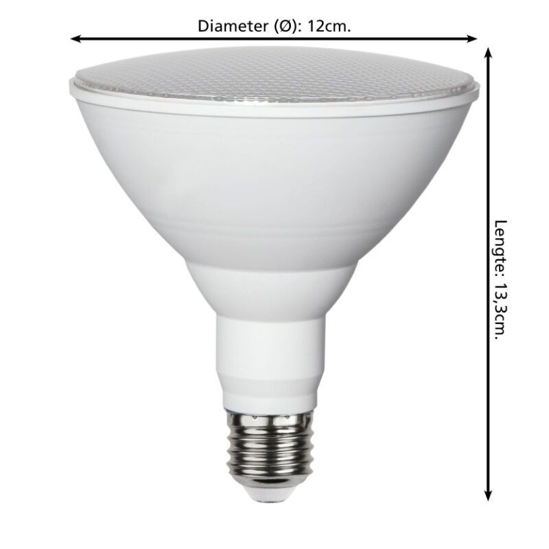 Met deze E27 LED PAR lamp kies je voor een energiezuinige LED lamp van hoge kwaliteit. De E27 LED PAR lamp heeft een gemiddelde levensduur van 15000 uur en een lichtopbrengst van 1200 lumen. Met een LED lamp bespaar je energie omdat de lamp een laag wattage heeft. Deze E27 LED PAR lamp heeft een vermogen van 16 Watt. Dit is de vervanger van een traditionele gloeilamp van ongeveer 144 Watt.