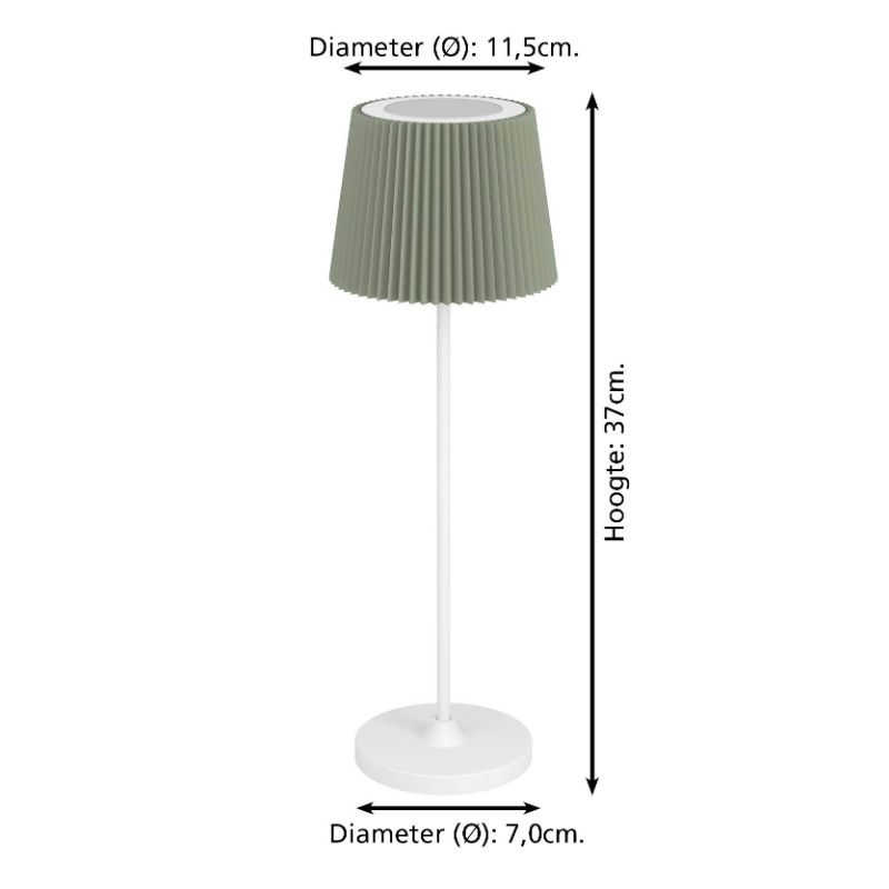 Product informatie Maximale wattage 2 Aansluitspanning Op batterij Aantal lampjes 1 Aantal lumen 300 Product informatie Lichtkleur White switch Type fitting LED ingebouwd Type lichtbron bijgevoegd Geïntegreerd LED Incl. lampje Ja, geïntegreerd Diameter in cm 11.5 Hoogte in cm 37 Dimbaar Ja (meegeleverd) Garantie 2 jaar IP waarde IP20 (stofdicht) Kleur Groen, Wit Materiaal Stof, Staal Met schakelaar Ja Stijl Modern Type schakelaar Aan/uit touch schakelaar op het product Artikelnummer Q27928 - Home