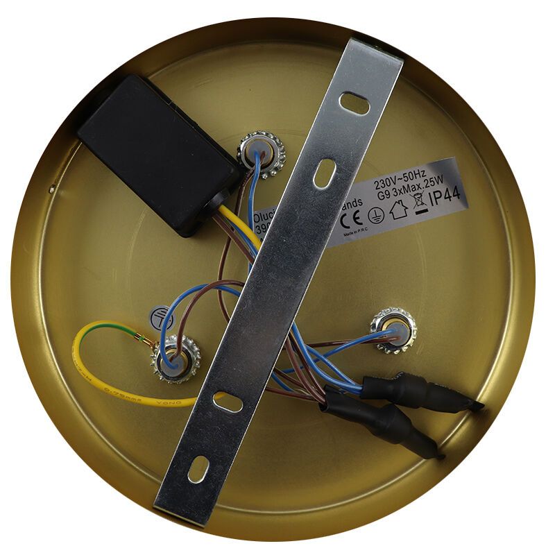 De moderne badkamer plafondlamp Callum is goud van kleur en gemaakt van glas. De gouden badkamer plafondlamp wordt geleverd exclusief bijpassende lichtbronnen. In deze lamp moeten 3 lichtbronnen met G9 fittingen. Het maximale wattage van de lichtbronnen mag niet hoger zijn dan 25 watt.