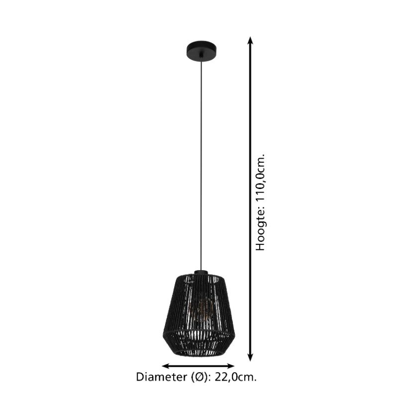 De papieren hanglamp Caine heeft de kleur zwart en een landelijk design. Deze landelijke hanglamp wordt zonder bijpassende lichtbron geleverd. De fitting van de lamp is een E27 fitting en het maximale vermogen van de lichtbron mag niet hoger zijn dan 60 watt.