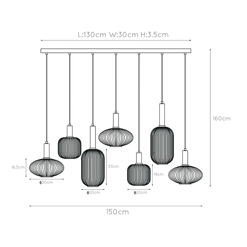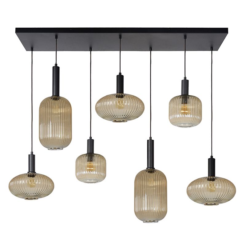 Product informatie Maximale wattage 40 Aansluitspanning 220-240V Aantal lampjes 7 Type fitting E27 Product informatie Incl. lampje Nee Breedte in cm 30 Gewicht in kg 11.5 Hoogte in cm 150 Kabellengte 130 Lengte in cm 130 Dimbaar Ja (niet meegeleverd) Garantie 2 jaar IP waarde IP20 (stofdicht) Kleur Zwart, Amber Materiaal Metaal, Glas Ruimte Woonkamer, Slaapkamer, Hal Stijl Retro Artikelnummer Q34182