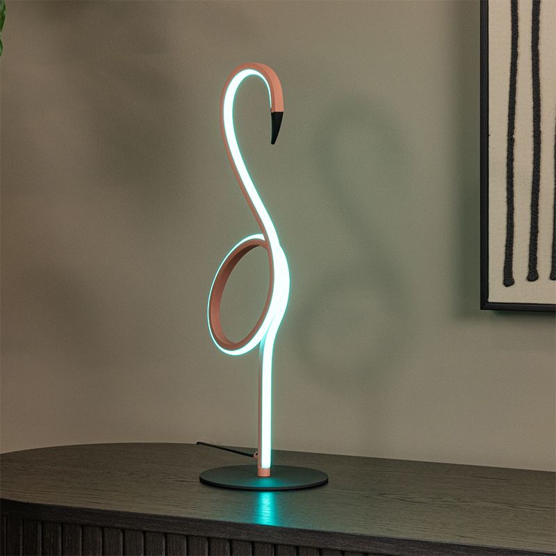 De roze tafellamp Flamingo heeft de stijl modern en is gemaakt van aluminium. Deze moderne tafellamp is voorzien van zuinig geïntegreerd LED licht. De geïntegreerde LED verlichting heeft een vermogen van 5,5 watt en de lichtkleur RGB (alle kleuren). Bij RGB verlichting kan je kiezen uit alle vrijwel alle lichtkleuren. Je bepaalt zo zelf met welke kleur je sfeer wil creëren in jouw kamer.