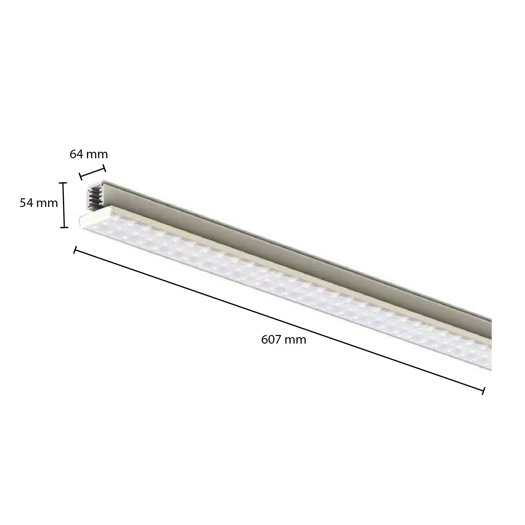 De 3-fase railarmatuur Tora heeft de volgende eigenschappen:• 60,7 cm lang, 6,4 cm breed en 5,4 cm hoog