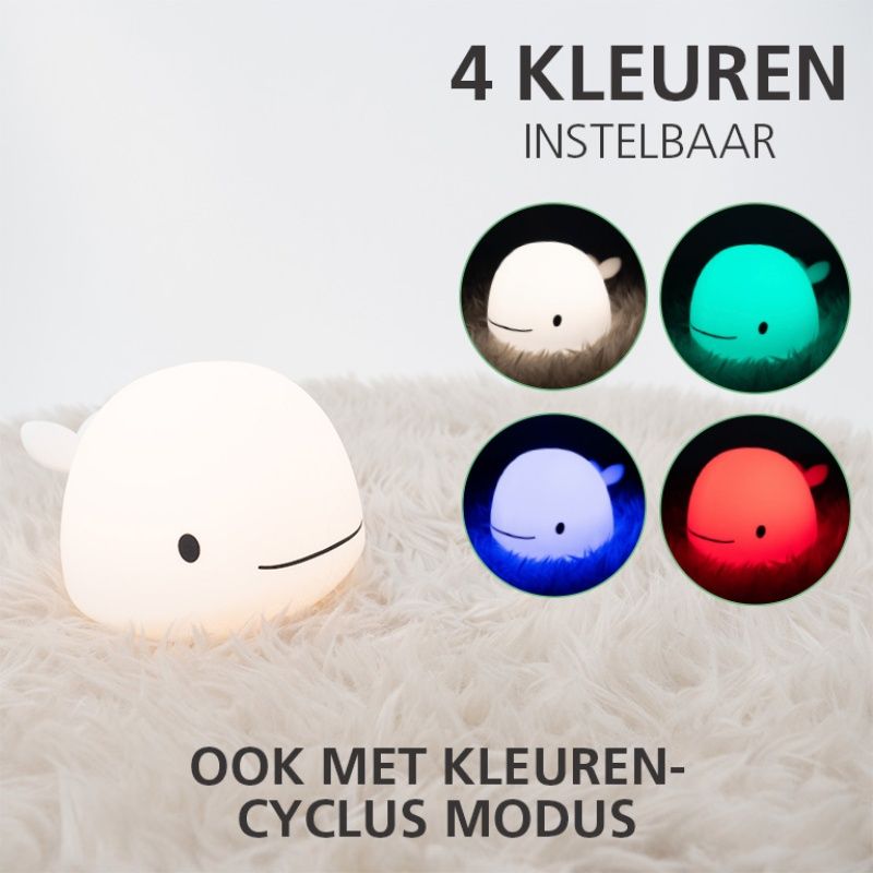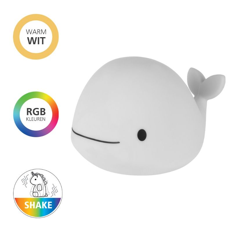 De witte kinderkamer tafellamp Whale is gemaakt van kunststof. De witte kinderkamer tafellamp is uitgevoerd met 5 watt geïntegreerd LED verlichting. De geïntegreerde LED verlichting heeft de lichtkleur RGBW (alle kleuren + wit). Bij RGBW verlichting kan je kiezen uit alle vrijwel alle lichtkleuren en wittinten. Je bepaalt zo zelf met welke kleur je sfeer creëert in jouw kamer.