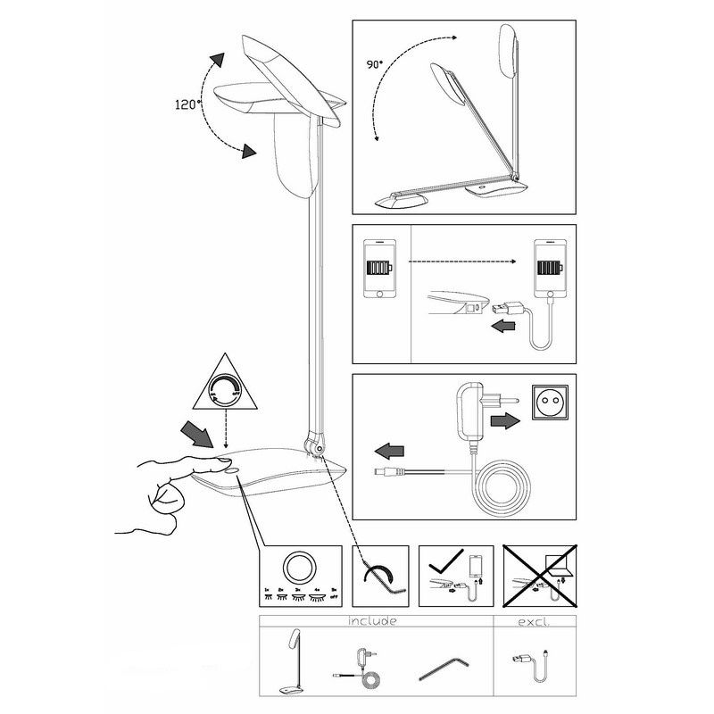 Product informatie Maximale wattage 5 Aansluitspanning 220-240V Energielabel D Aantal lampjes 1 Product informatie Aantal lumen 550 Kleurweergave >80 Lichtkleur 4000K (wit) Type fitting LED ingebouwd Type lichtbron bijgevoegd Geïntegreerd LED Verwachte aantal branduren 25000 Incl. lampje Ja, geïntegreerd Breedte in cm 10 Gewicht in kg 1 Hoogte in cm 50 Kabellengte 120 Lengte in cm 15 Dimbaar Ja (meegeleverd) Garantie 2 jaar IP waarde IP20 (stofdicht) Kleur Wit Materiaal Kunststof Met schakelaar Ja Stijl Modern Type schakelaar Aan/uit touch schakelaar op het product Artikelnummer Q16846 - Home