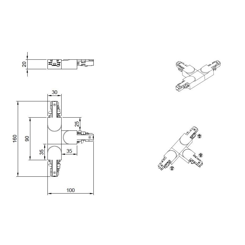- Zwart T-stuk met geleider rechts, 2-fase