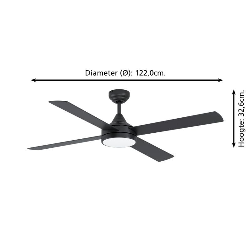 Special Price 109,- Adviesprijs: Regular Price 139,-Op voorraad Moderne plafondventilator zwart, Huub, 40W, 3000K LED, met afstandsbediening- D: 51 cm, H: 23 cm