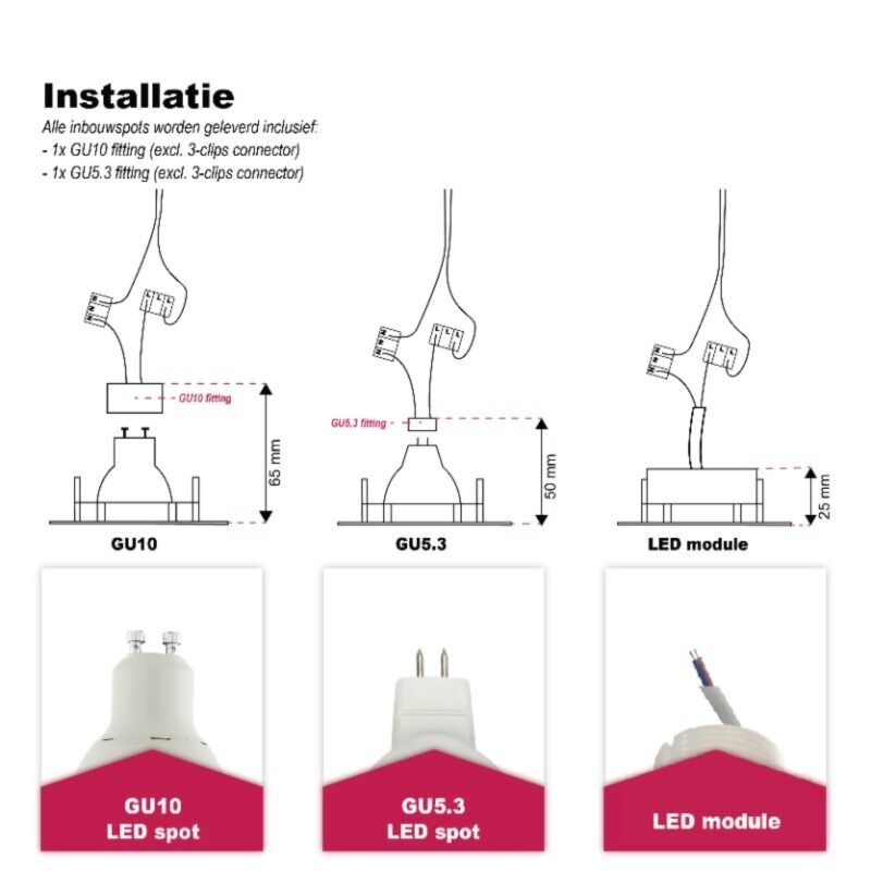 Wil je de inbouwspot gebruiken met een 230V lichtbron? Koop dan een GU10 fitting en GU10 LED lamp bij deze inbouwspot.